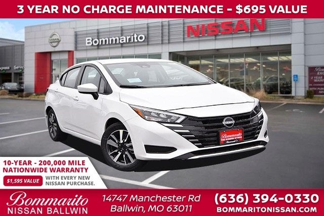 White 2025 Nissan Versa 1.6 SV 4D Sedan FWD CVT 1.6L I4 DOHC 16V Shopping Bag Hooks, Trunk Net, Trunk Package. 32/40 City/Highway MPG Every New Nissan receives a 10 year/ 200,000 mile nationwide warranty and 3 years of NO CHARGE maintenance included! Visit Missouri's #1 Automotive Group for a better price and better service.