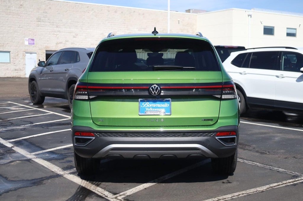 Bright Moss Green Metallic 2026 Volkswagen Taos 1.5T SE AWD 8-Speed Automatic with Tiptronic 1.5L I4 Turbocharged DOHC 16V LEV3-SULEV30 174hp 4-Wheel Disc Brakes, 6 Speakers, ABS brakes, Active Blind Spot Monitor, Air Conditioning, Alloy wheels, AM/FM radio: SiriusXM with 360L, Auto High-beam Headlights, Auto-Dimming Rear-View Mirror, Automatic temperature control, Brake assist, Bumpers: body-color, Cloudtex and Cloth Seating Surfaces, Compass, Delay-off headlights, Driver door bin, Driver vanity mirror, Dual front impact airbags, Dual front side impact airbags, Electronic Stability Control, Emergency communication system: VW Car-Net Safe & Secure 5-year, Exterior Parking Camera Rear, Four wheel independent suspension, Front anti-roll bar, Front Bucket Seats, Front Center Armrest, Front dual zone A/C, Front reading lights, Front Strut Rear Multi-Link Suspension, Fully automatic headlights, Heated door mirrors, Heated Front Bucket Seats, Heated front seats, Heated steering wheel, Illuminated entry, Leather Shift Knob, Low tire pressure warning, Occupant sensing airbag, Outside temperature display, Overhead airbag, Overhead console, Panic alarm, Passenger door bin, Passenger vanity mirror, Power door mirrors, Power driver seat, Power steering, Power windows, Radio data system, Radio: MIB3 Composition Media AM/FM/HD, Rain sensing wipers, Rear anti-roll bar, Rear seat center armrest, Rear window defroster, Rear window wiper, Remote keyless entry, Rubber Mats Kit, Security system, Speed control, Speed-sensing steering, Split folding rear seat, Spoiler, Steering wheel mounted audio controls, Tachometer, Telescoping steering wheel, Tilt steering wheel, Traction control, Trip computer, Variably intermittent wipers, VW Care, Wheels: 18" 2-Tone Machined Alloy.