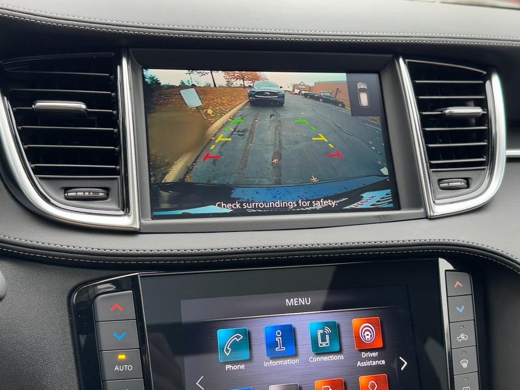 INFINITI Certified Pre-Owned Certified, 4-Wheel Disc Brakes, 6 Speakers, ABS brakes, Air Conditioning, Alloy wheels, AM/FM radio: SiriusXM, Auto High-beam Headlights, Auto-dimming Rear-View mirror, Automatic temperature control, Bose 12-Speaker Premium Audio, Brake assist, Bumpers: body-color, CD player, Delay-off headlights, Driver door bin, Driver vanity mirror, Dual front impact airbags, Dual front side impact airbags, Electronic Stability Control, Emergency communication system: INFINITI InTouch (1-year complimentary trial), Exterior Parking Camera Rear, Floor Mats, Four wheel independent suspension, Front anti-roll bar, Front Bucket Seats, Front Center Armrest, Front dual zone A/C, Front reading lights, Fully automatic headlights, Garage door transmitter: HomeLink, Heated door mirrors, Heated Front Bucket Seats, Heated front seats, Illuminated entry, Illuminated Kick Plates, Knee airbag, Leather Shift Knob, Leather steering wheel, Leather-Appointed Seat Trim, Literature Kit, Low tire pressure warning, Memory seat, Occupant sensing airbag, Outside temperature display, Overhead airbag, Overhead console, Panic alarm, Passenger door bin, Passenger vanity mirror, Power door mirrors, Power driver seat, Power Liftgate, Power moonroof, Power passenger seat, Power steering, Power windows, Radio data system, Radio: HD Audio System, Rear anti-roll bar, Rear Parking Sensors, Rear reading lights, Rear seat center armrest, Rear side impact airbag, Rear window defroster, Rear window wiper, Remote keyless entry, Security system, Speed control, Speed-sensing steering, Speed-Sensitive Wipers, Splash Guards (Set of 4), Split folding rear seat, Spoiler, Steering wheel mounted audio controls, Tachometer, Telescoping steering wheel, Tilt steering wheel, Traction control, Trip computer, Turn signal indicator mirrors, Variably intermittent wipers, Wheels: 19" Silver Painted Aluminum Alloy.
