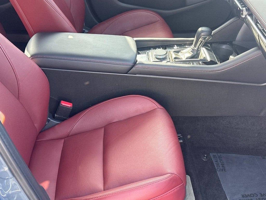 This Mazda Mazda3 is well equipped with 4-Wheel Disc Brakes, 8 Speakers, ABS brakes, Air Conditioning, Alloy wheels, AM/FM radio, Auto High-beam Headlights, Automatic temperature control, Black Lug Nuts & Black Wheel Locks, Brake assist, Bumpers: body-color, Compass, Delay-off headlights, Driver door bin, Driver vanity mirror, Dual front impact airbags, Dual front side impact airbags, Electronic Stability Control, Emergency communication system: Mazda Connected Services (3-year complimentary trial included), Exterior Parking Camera Rear, Front anti-roll bar, Front Bucket Seats, Front Center Armrest, Front dual zone A/C, Front Illuminated Door Sill Trim Plates, Front reading lights, Front wheel independent suspension, Fully automatic headlights, Heated door mirrors, Heated front seats, Heated Front Sport Bucket Seats, Illuminated entry, Knee airbag, Leather Seat Trim, Leather Shift Knob, Leather steering wheel, Low tire pressure warning, MAZDA CONNECT Infotainment System, Memory seat, Occupant sensing airbag, Outside temperature display, Overhead airbag, Overhead console, Panic alarm, Passenger door bin, Passenger vanity mirror, Power door mirrors, Power driver seat, Power moonroof, Power steering, Power windows, Radio data system, Radio: AM/FM/HD Audio System, Rain sensing wipers, Rear seat center armrest, Rear side impact airbag, Rear window defroster, Remote keyless entry, Speed control, Speed-sensing steering, Split folding rear seat, Steering wheel mounted audio controls, Tachometer, Telescoping steering wheel, Tilt steering wheel, Traction control, Trip computer, Turn signal indicator mirrors, Variably intermittent wipers, and Wheels: 18" x 7J Aluminum Alloy.
